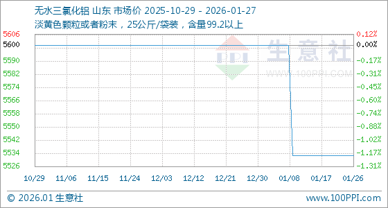1月27日,生意社无水三氯化铝基准价为5533.33元/吨,与本月初(5600.00元/吨)相比,下降了1.19%。