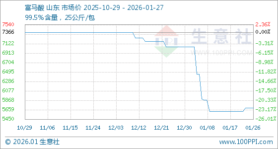 1月27日,生意社富马酸基准价为5700.00元/吨,与本月初(7050.00元/吨)相比,下降了19.15%。