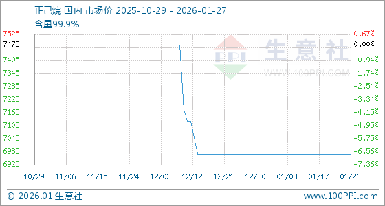 1月27日,生意社正己烷基准价为6975.00元/吨,与本月初持平。