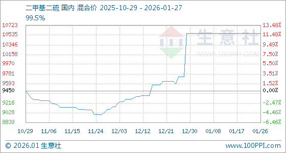 1月27日,生意社二甲基二硫基准价为10566.67元/吨,与本月初持平。