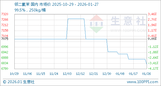 1月27日,生意社邻二氯苯基准价为6825.00元/吨,与本月初(6950.00元/吨)相比,下降了1.8%。