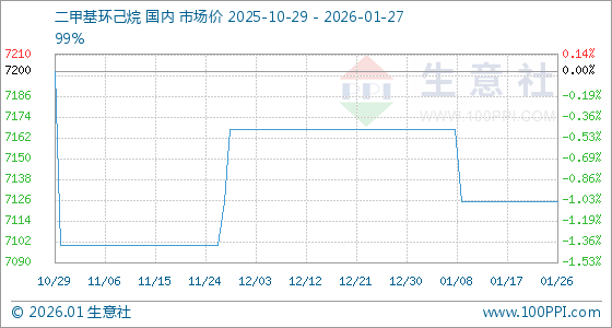 1月27日,生意社二甲基环己烷基准价为7125.00元/吨,与本月初(7166.67元/吨)相比,下降了0.58%。