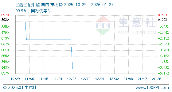 1月27日,生意社乙酰乙酸甲酯基准价为8420.00元/吨,与本月初持平。