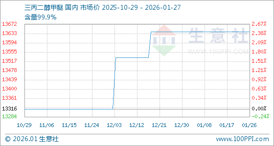 1月27日,生意社三丙二醇甲醚基准价为13640.00元/吨,与本月初持平。