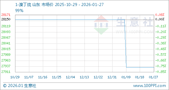 1月27日,生意社1-溴丁烷基准价为27933.33元/吨,与本月初(28150.00元/吨)相比,下降了0.77%。