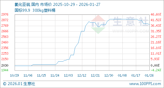 1月27日,生意社氯化亚砜基准价为2790.00元/吨,与本月初(2890.00元/吨)相比,下降了3.46%。