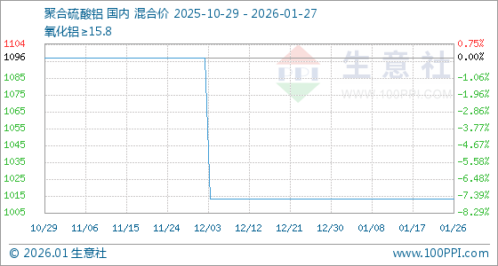 1月27日,生意社聚合硫酸铝基准价为1014.00元/吨,与本月初持平。