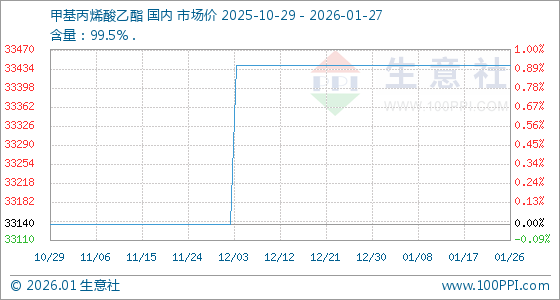 1月27日,生意社甲基丙烯酸乙酯基准价为33440.00元/吨,与本月初持平。
