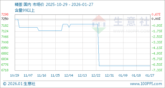 1月27日,生意社精萘基准价为6766.67元/吨,与本月初持平。