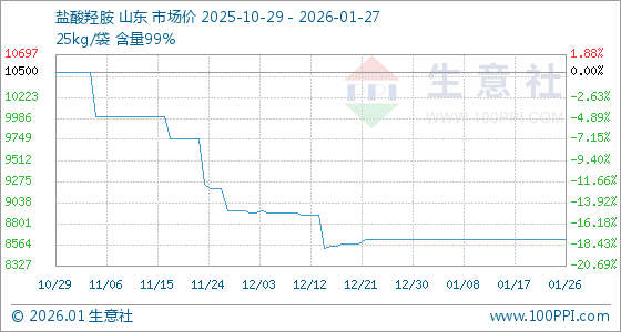 1月27日,生意社盐酸羟胺基准价为8625.00元/吨,与本月初持平。