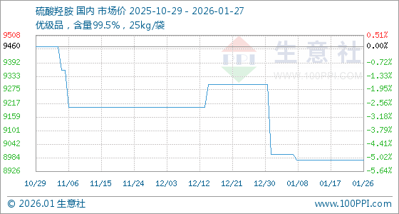 1月27日,生意社硫酸羟胺基准价为8975.00元/吨,与本月初(9300.00元/吨)相比,下降了3.49%。