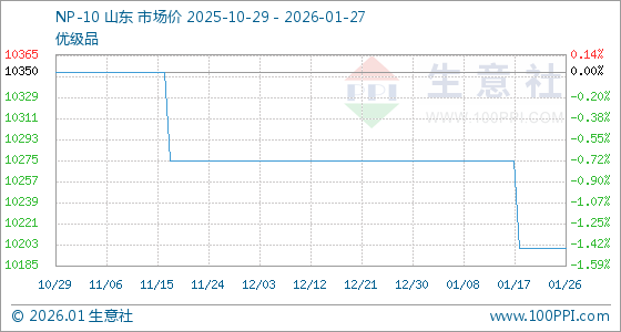 1月27日,生意社NP-10基准价为10200.00元/吨,与本月初(10275.00元/吨)相比,下降了0.73%。