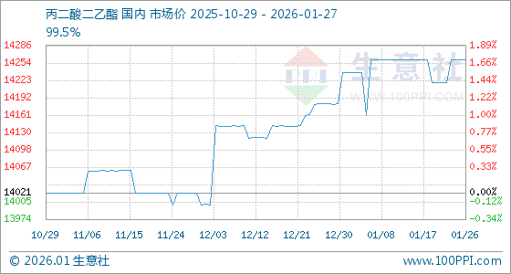 1月27日,生意社丙二酸二乙酯基准价为14260.00元/吨,与本月初(14237.60元/吨)相比,上涨了0.16%。