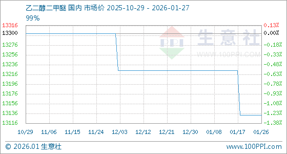 1月27日,生意社乙二醇二甲醚基准价为13133.33元/吨,与本月初(13225.00元/吨)相比,下降了0.69%。