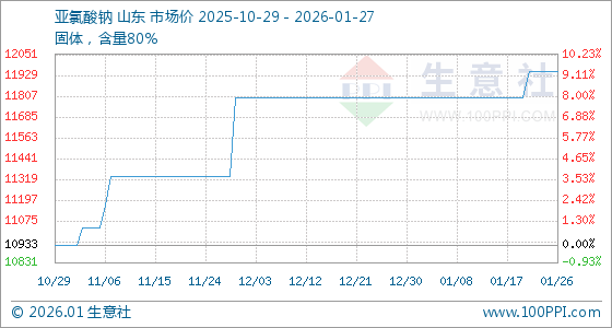 1月27日,生意社亚氯酸钠基准价为11950.00元/吨,与本月初(11800.00元/吨)相比,上涨了1.27%。