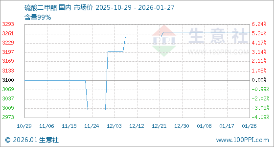 1月27日,生意社硫酸二甲酯基准价为3266.67元/吨,与本月初持平。