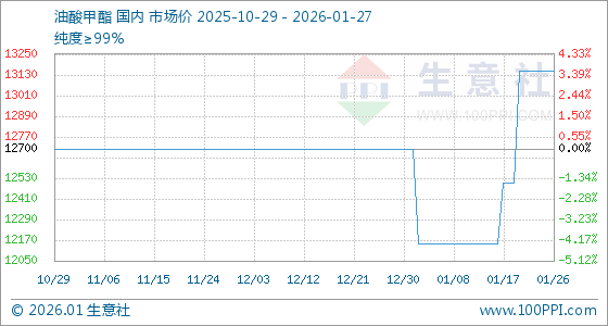 1月27日,生意社油酸甲酯基准价为13150.00元/吨,与本月初(12700.00元/吨)相比,上涨了3.54%。