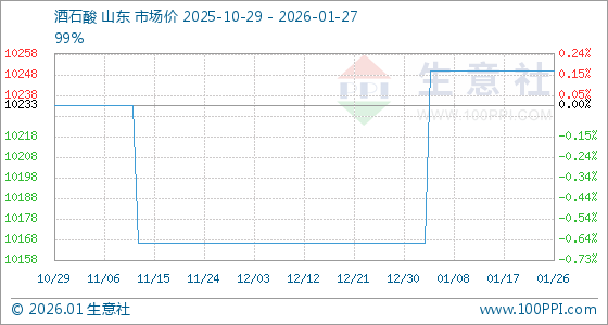 1月27日,生意社酒石酸基准价为10250.00元/吨,与本月初(10166.67元/吨)相比,上涨了0.82%。