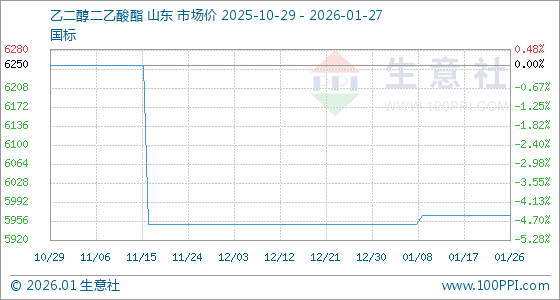 1月27日,生意社乙二醇二乙酸酯基准价为5966.67元/吨,与本月初(5950.00元/吨)相比,上涨了0.28%。