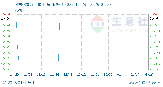 1月27日,生意社过氧化氢叔丁醇基准价为10400.00元/吨,与本月初持平。