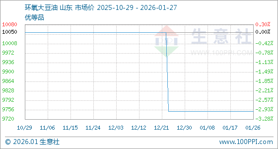1月27日,生意社环氧大豆油基准价为9750.00元/吨,与本月初持平。