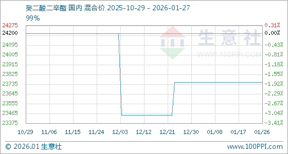 1月27日,生意社癸二酸二辛酯基准价为23750.00元/吨,与本月初持平。