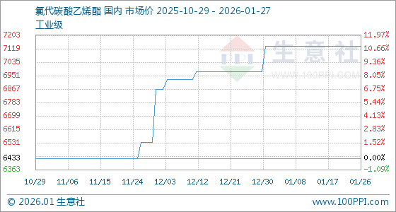 1月27日,生意社氯代碳酸乙烯酯基准价为7133.33元/吨,与本月初持平。
