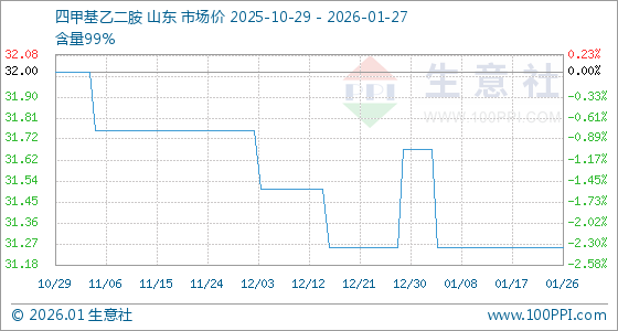 1月27日,生意社四甲基乙二胺基准价为31.25元/千克,与本月初(31.67元/千克)相比,下降了1.33%。