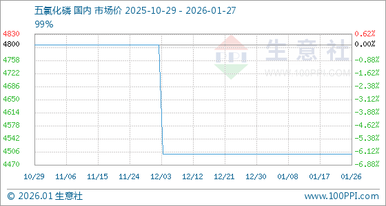 1月27日,生意社五氯化磷基准价为4500.00元/吨,与本月初持平。