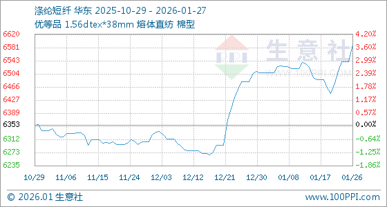 1月27日,生意社涤纶短纤基准价为6587.96元/吨,与本月初(6507.33元/吨)相比,上涨了1.24%。