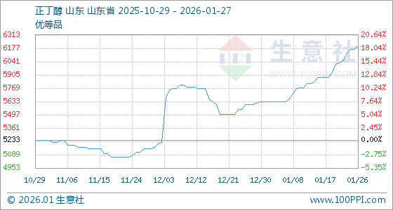 1月27日,生意社正丁醇(工业级)基准价为6200.00元/吨,与本月初(5633.33元/吨)相比,上涨了10.06%。