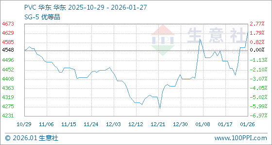1月27日,生意社PVC基准价为4637.00元/吨,与本月初(4409.00元/吨)相比,上涨了5.17%。