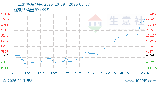 1月27日,生意社丁二烯基准价为10733.33元/吨,与本月初(8333.33元/吨)相比,上涨了28.80%。