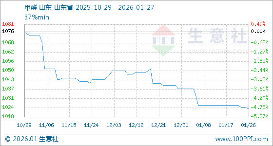 1月27日,生意社甲醛基准价为1023.75元/吨,与本月初(1037.50元/吨)相比,下降了1.33%。
