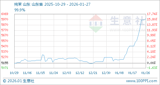 1月27日,生意社纯苯基准价为5986.67元/吨,与本月初(5268.67元/吨)相比,上涨了13.63%。