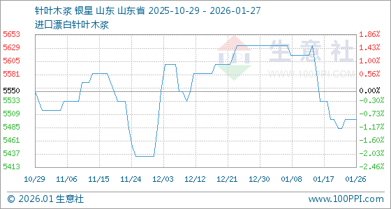 1月27日,生意社针叶木浆基准价为5500.00元/吨,与本月初(5633.33元/吨)相比,下降了2.37%。