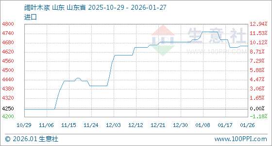 1月27日,生意社阔叶木浆基准价为4660.00元/吨,与本月初(4683.33元/吨)相比,下降了0.5%。