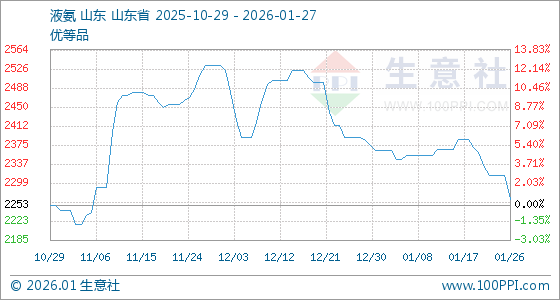 1月27日,生意社液氨基准价为2266.67元/吨,与本月初(2363.33元/吨)相比,下降了4.09%。