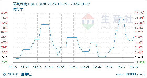 1月27日,生意社环氧丙烷基准价为8200.00元/吨,与本月初(7733.33元/吨)相比,上涨了6.03%。