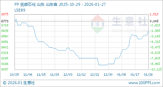 1月27日,生意社PP(拉丝)基准价为6646.67元/吨,与本月初(6170.00元/吨)相比,上涨了7.73%。