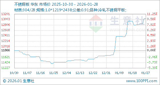 1月28日,生意社不锈钢板基准价为13036.67元/吨,与本月初(11691.67元/吨)相比,上涨了11.50%。