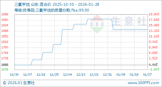 1月28日,生意社三氯甲烷基准价为1900.00元/吨,与本月初(1966.67元/吨)相比,下降了3.39%。