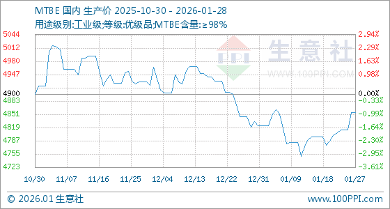 1月28日,生意社MTBE基准价为4856.67元/吨,与本月初(4823.33元/吨)相比,上涨了0.69%。