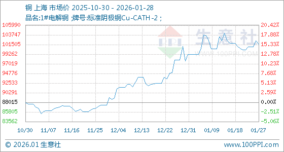 1月28日,生意社铜基准价为101520.00元/吨,与本月初(99180.00元/吨)相比,上涨了2.36%。