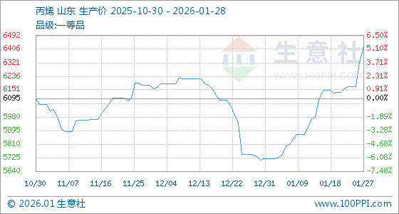 1月28日,生意社丙烯基准价为6421.00元/吨,与本月初(5717.67元/吨)相比,上涨了12.30%。