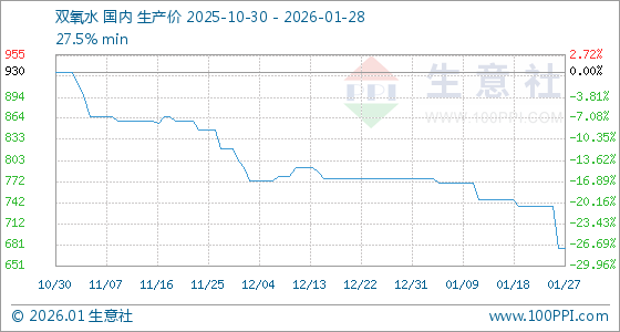 1月28日,生意社双氧水基准价为676.67元/吨,与本月初(776.67元/吨)相比,下降了12.88%。