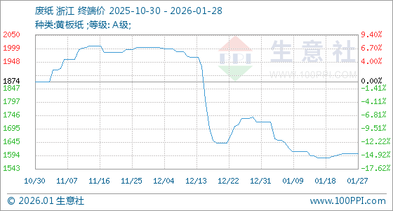 1月28日,生意社废纸基准价为1602.00元/吨,与本月初(1720.00元/吨)相比,下降了6.86%。