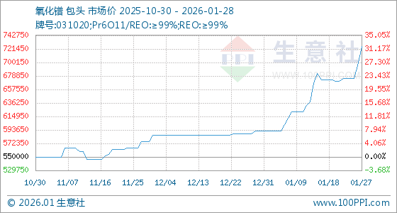 1月28日,生意社氧化镨基准价为725000.00元/吨,与本月初(592500.00元/吨)相比,上涨了22.36%。