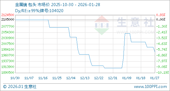 1月28日,生意社金属镝基准价为1975000.00元/吨,与本月初(1910000.00元/吨)相比,上涨了3.40%。