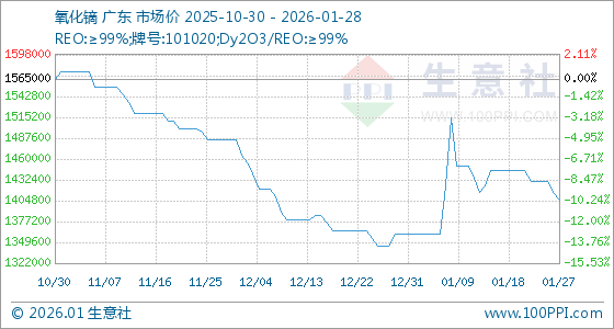 1月28日,生意社氧化镝基准价为1405000.00元/吨,与本月初(1360000.00元/吨)相比,上涨了3.31%。